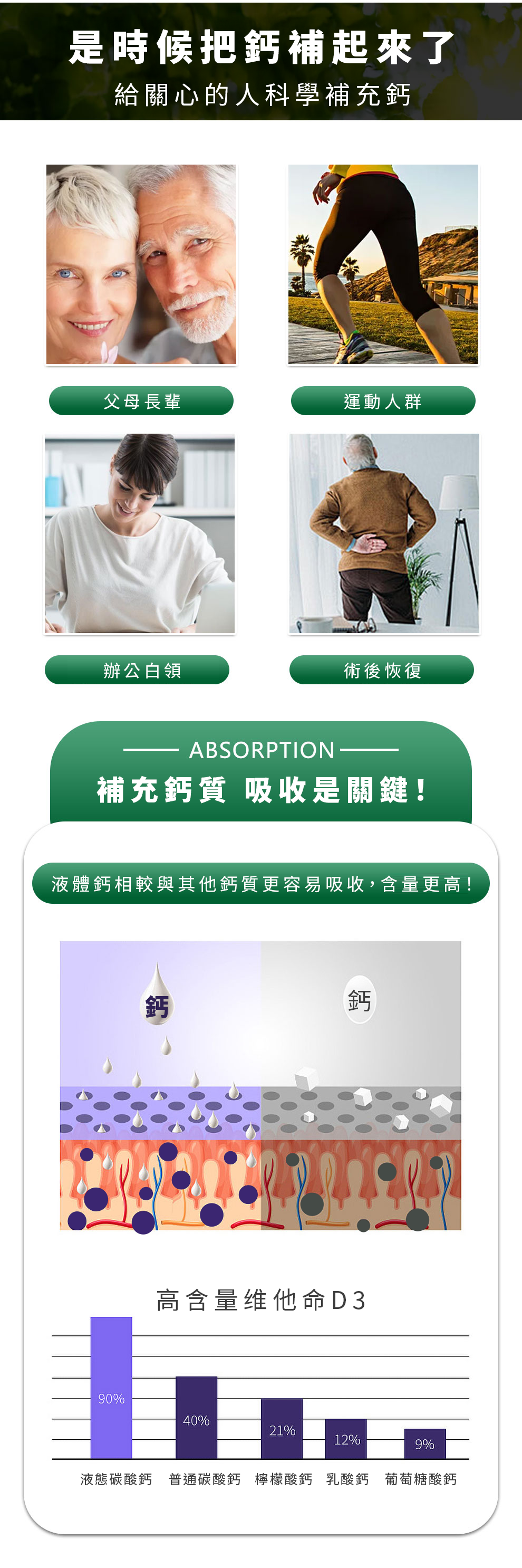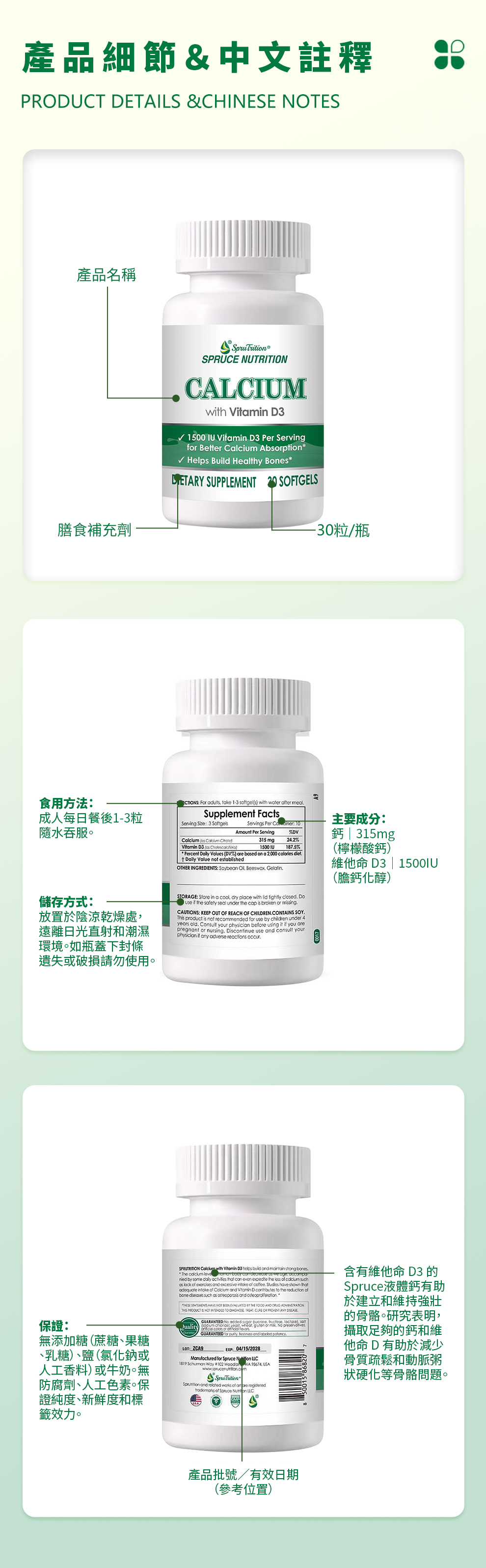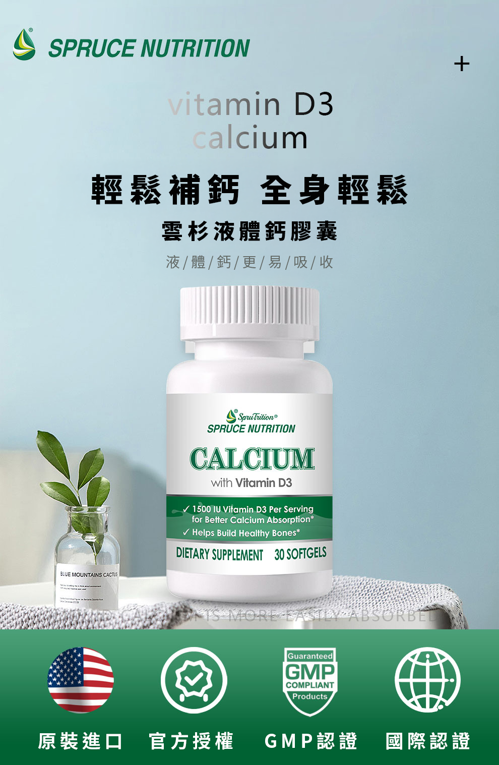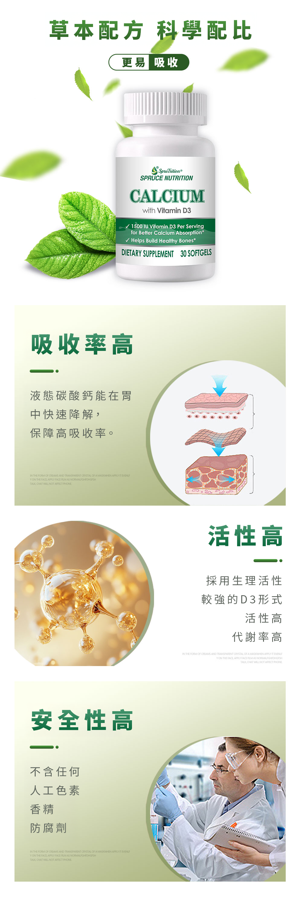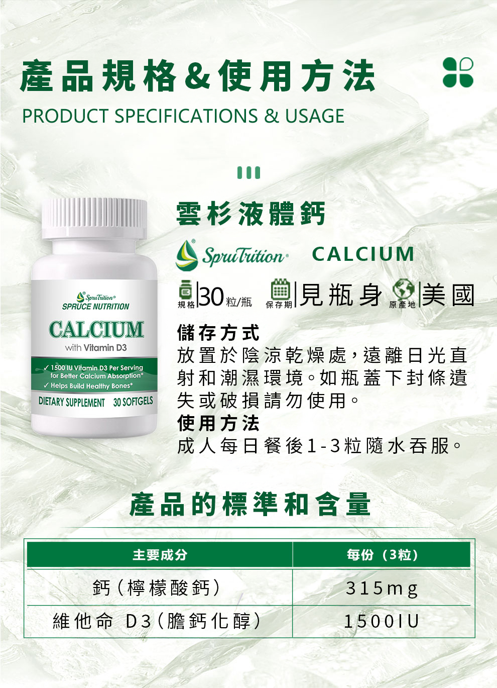 雲杉液體鈣膠囊採用科學萃取的液態碳酸鈣配方,結合高活性維他命 D3(1500IU),專為解決 35歲後鈣質流失問題而設計。經研究顯示,液體鈣在胃部降解速度較快,能有效提升生物利用率,是維持骨骼結構與肌肉功能的理想選擇。